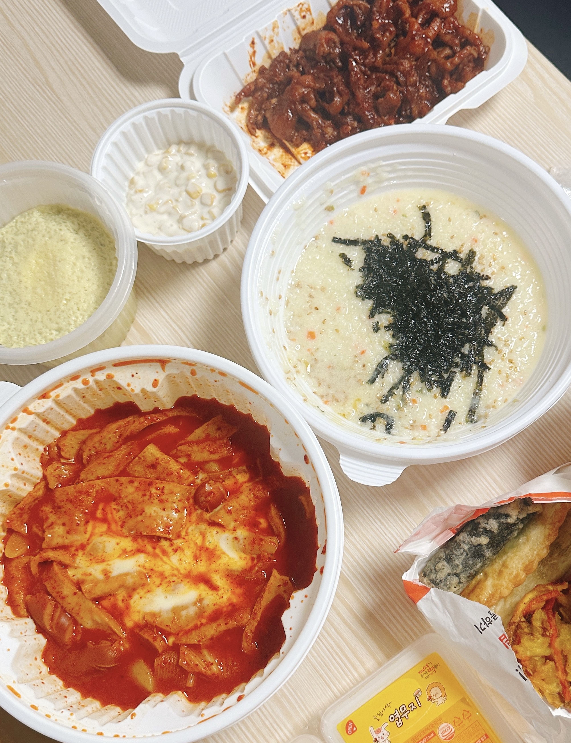 맛있게 매운 음식이 당길 때 동대문엽기떡볶이와 무뼈닭발 그리고 매운 속을 달래줄 사이드 메뉴로 계란야채죽, 계란찜, 토핑 콘마요 추천합니다!