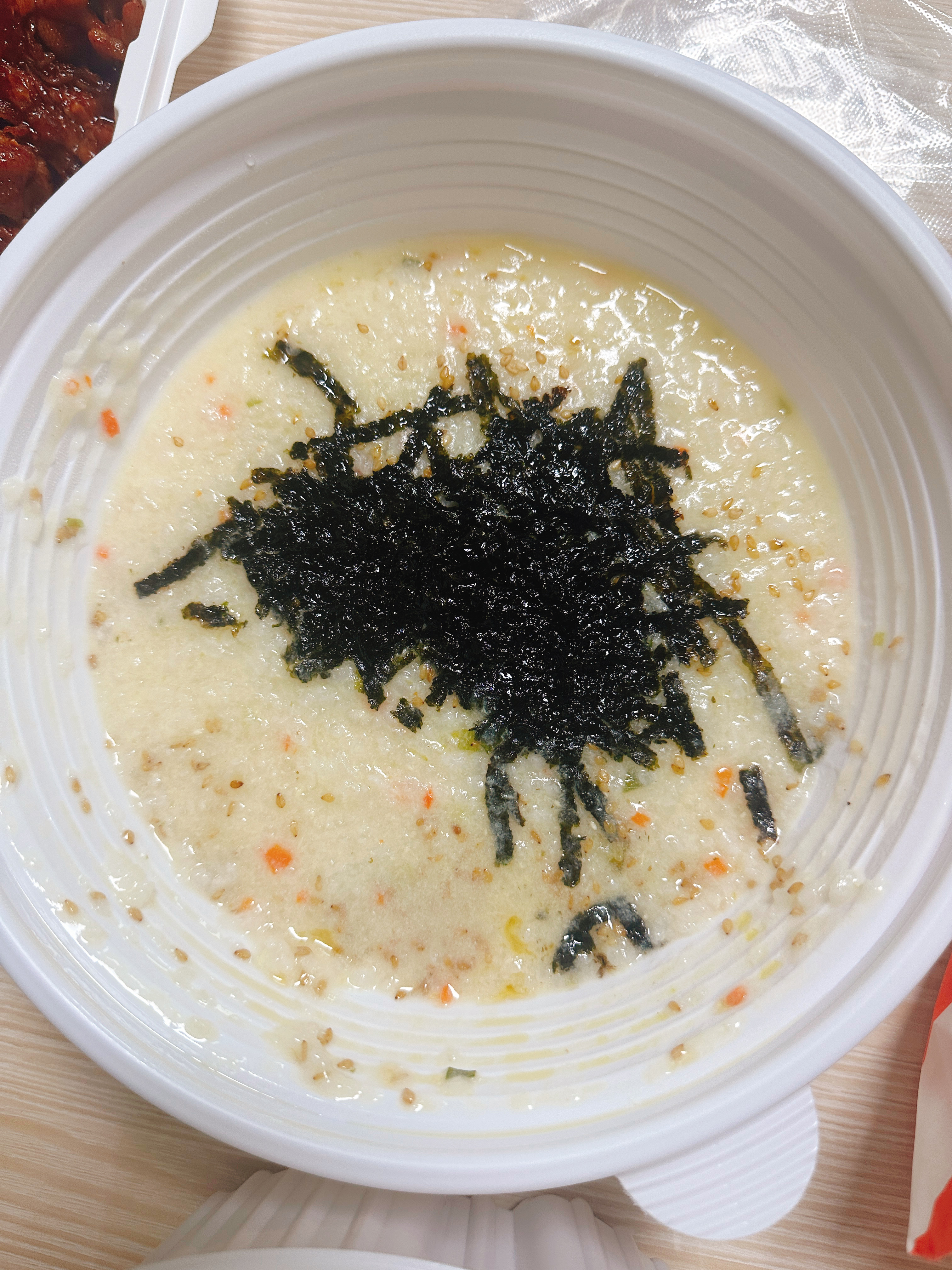 계란야채죽 양도 많고 계란을 풀어서 꾸덕하면서도 잘게 썰어져 있는 야채와 솔솔 뿌려져 있는 김과 참깨가 어우러져 부드러우면서 고소하니 맛있더라고요.